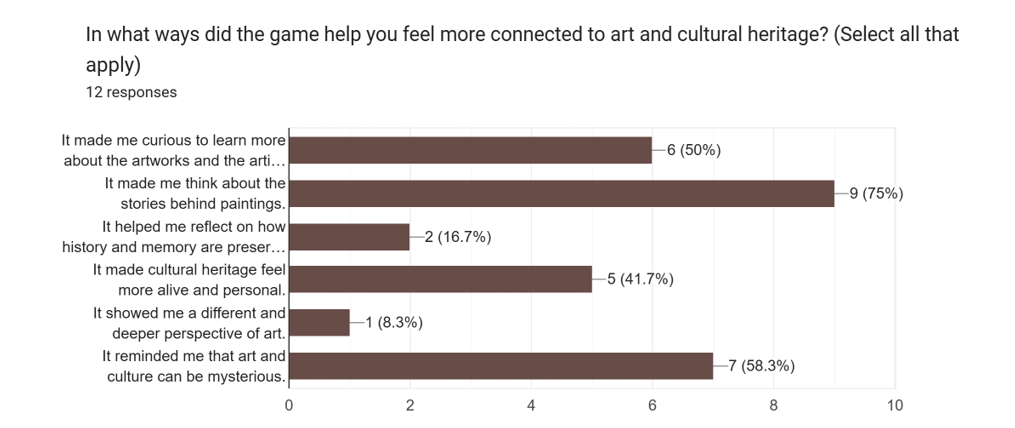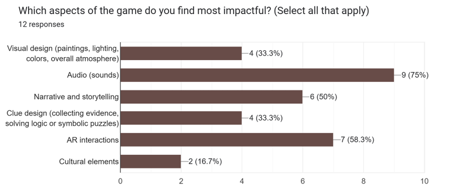 These changes strengthened the narrative flow and reduced confusion. Playtesters found the AR mystery engaging, and several expressed that they learned something new about cultural history, which fulfilled our goal of cultural empowerment through gameplay.