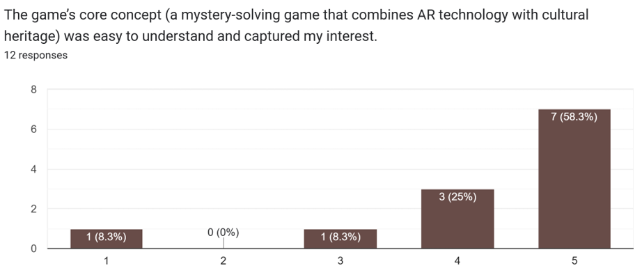 • Concept clarity and engagement: Over 80% of participants found the game’s core concept easy to understand and engaging (on a 5-point scale, seven users rated it a 5 and three gave it a 4).