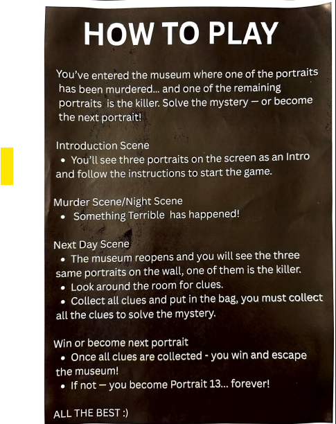 Our game blends AR puzzle exploration with narrative-driven gameplay, immersing players in a museum where paintings whisper hidden stories each night. Through interacting, and solving art-based puzzles, players uncover clues tied to real-world cultures, artistic movements, and historical censorship. The symbolic murder mystery at the heart of the game highlights silenced voices and suppressed expression, encouraging players to engage critically with cultural memory and restoration.